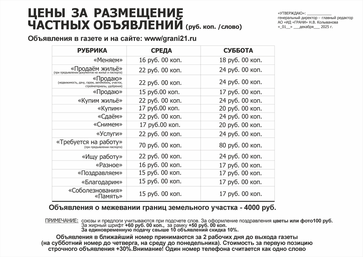 Подать объявление можно дистанционно, написав текст на электронный адрес bux@grani21.ru.