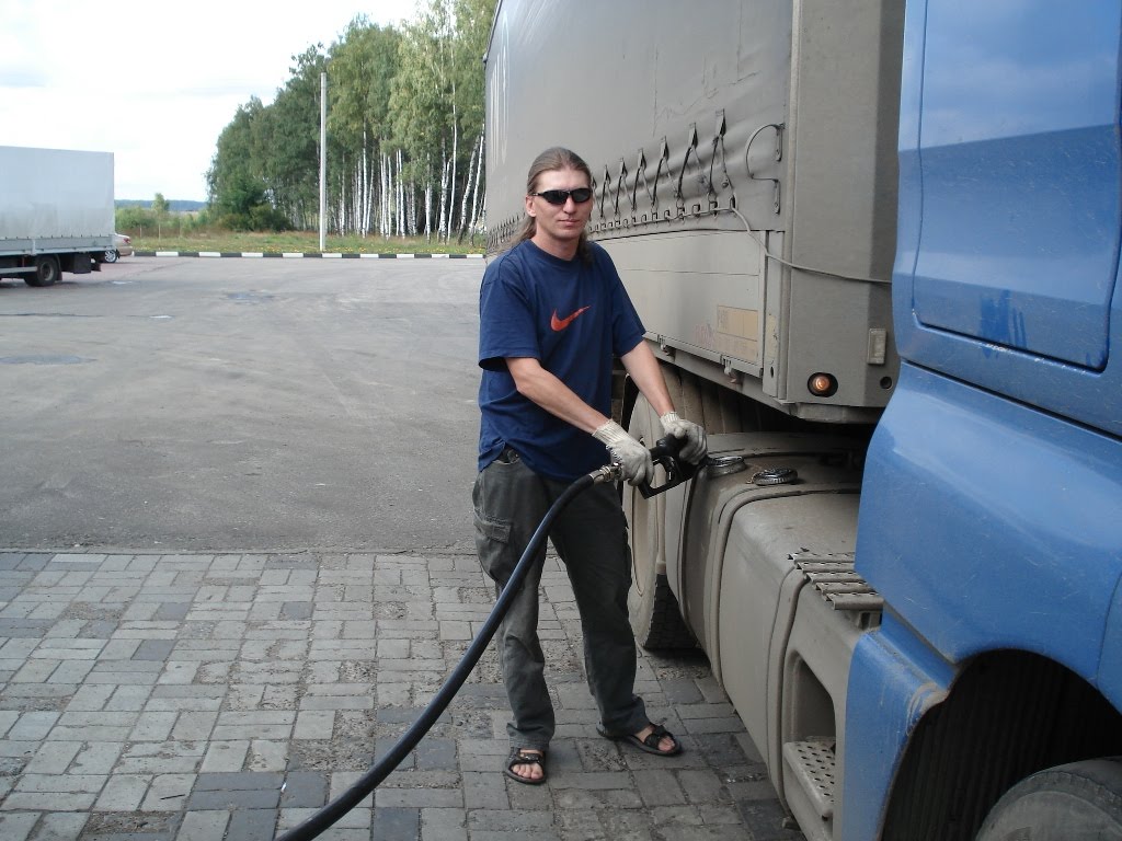 2. Как и любую машину, перед дальней дорогой тягач следует хорошенько заправить. Цена такой заправки по сегодняшним меркам обходится, примерно в двадцать тысяч рублей. Много это или мало решайте сами. Кстати на этой фотографии засветился и автор всех снимков, Денис. «Блог Дальнобойщик» выражает ему признательность за предоставленный материал.