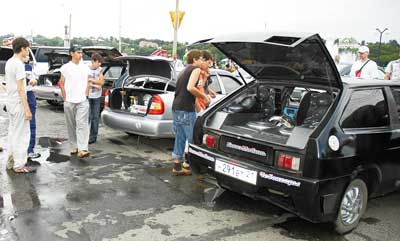 Затем началось состязание “Автозвук” (на снимке). В нем мог участвовать любой желающий. Претенденты на победу демонстрировали возможности акустических систем своих автомобилей: размещение колонок в салоне и их оформление, чистоту и качество звучания.