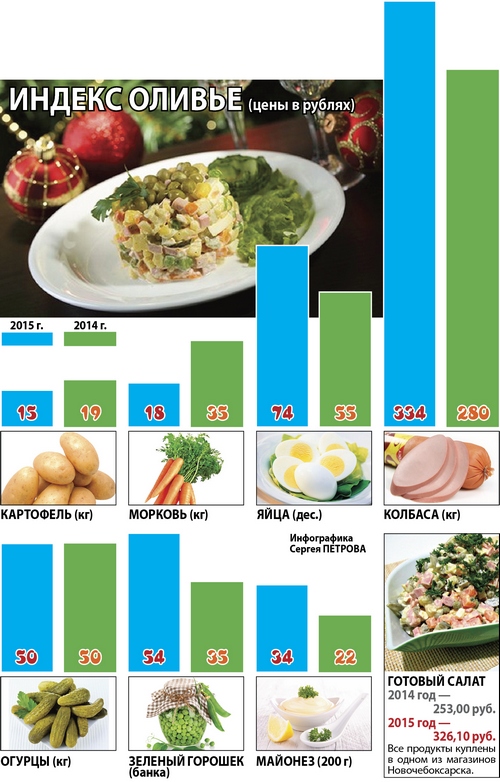 В “Гранях” мы “готовим” свой салат — по-новочебоксарски. Какие цены были в прошлом году на основные продукты, необходимые для приготовления этого салата, и стоимость оливье по-новочебоксарски‑2015 смотрите на инфографике.